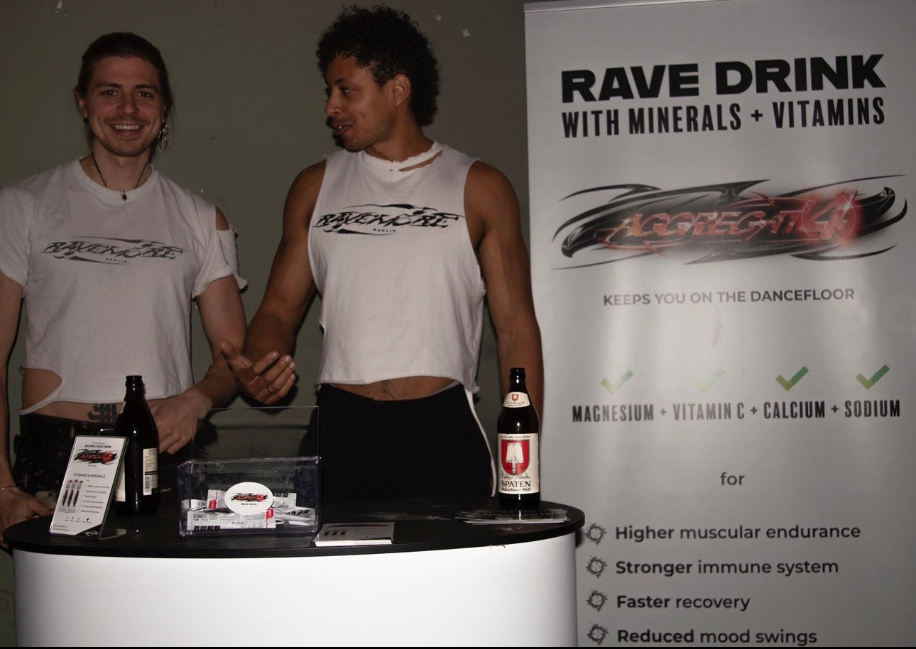 RAVEMORE's journey began with AGGREGAT(4), a supplement designed to support ravers by naturally replenishing vital nutrients like calcium, magnesium, sodium, and vitamin C during raves. This initiative was more than just a health-focused project; it was a statement of care and commitment to a demographic of people that thrives on energy and endurance.