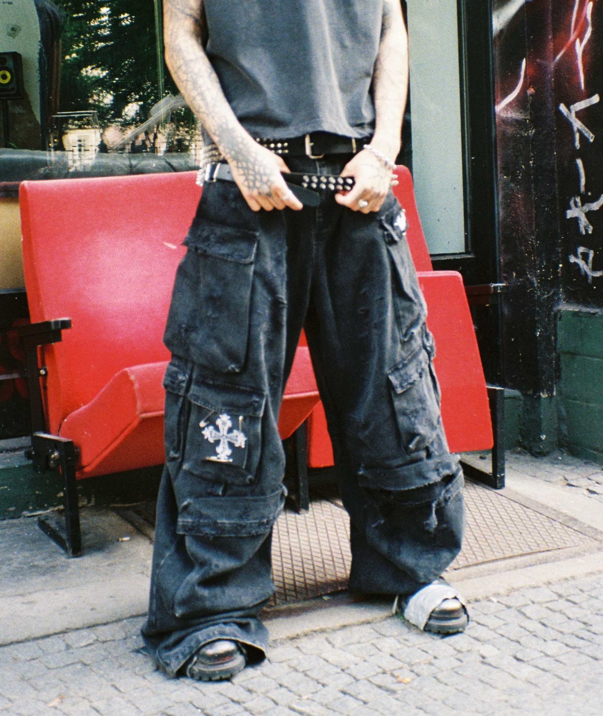 Washed out black, heavy denim in oversized fit – same cut as our Combat Camo Pants.