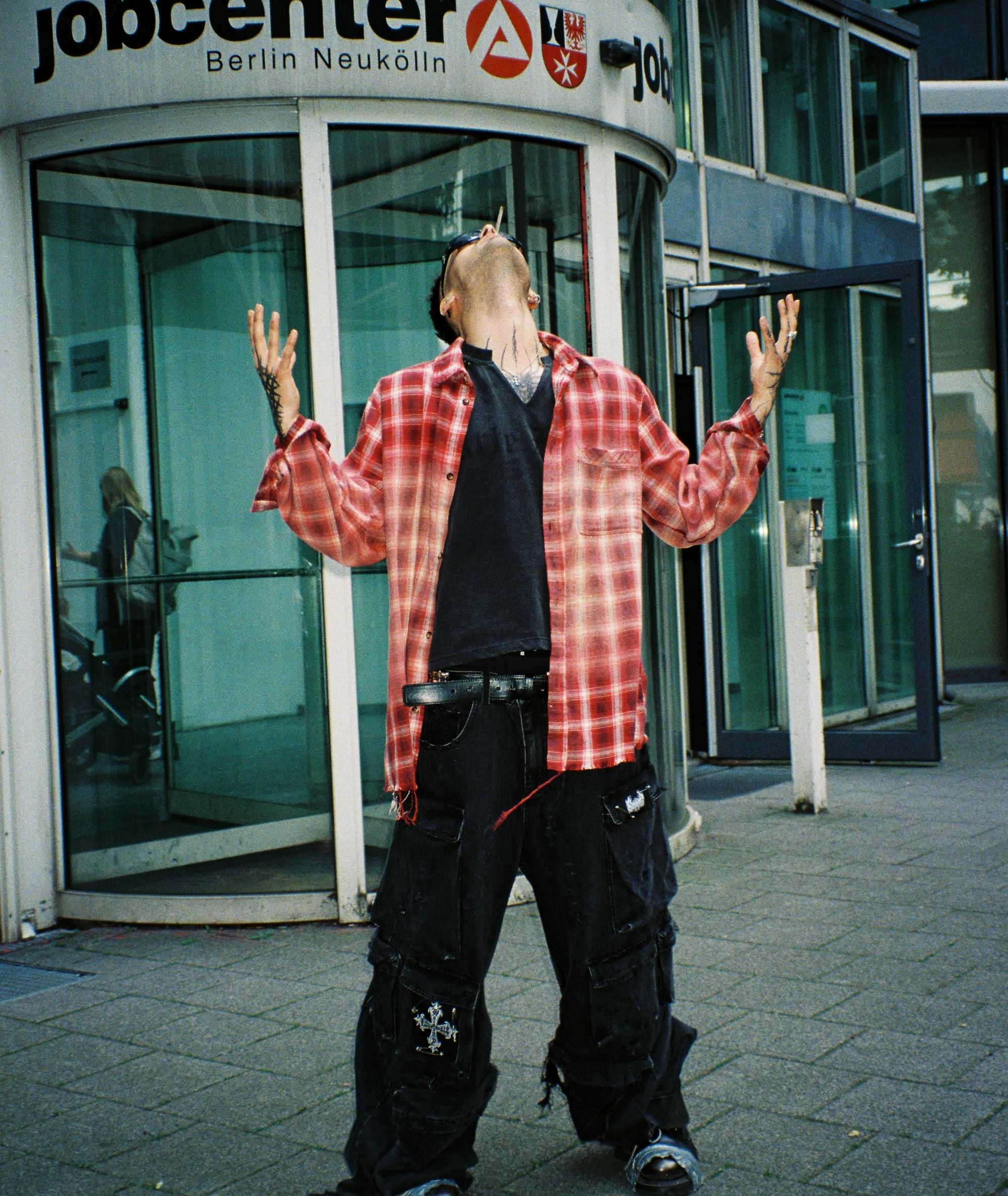 The final finishing steps such as distressing the pants & applying the patches are all done by hand in our Studio in Berlin-Kreuzberg. This makes every single pants unique.