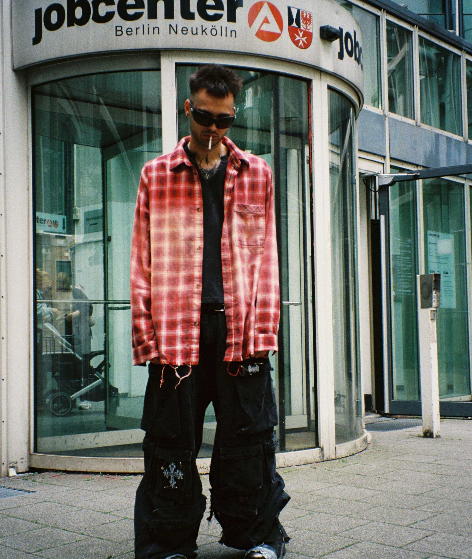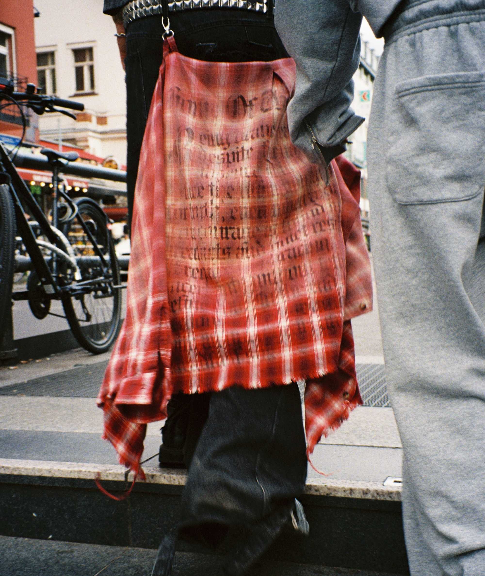 Oversized red lumberjack flannel with a back print that defines what it means to be brave. Subtle shoulder tabs let you clip it to your pants – turning the shirt into a waist-worn skirt.