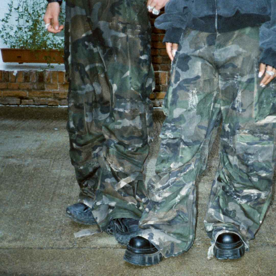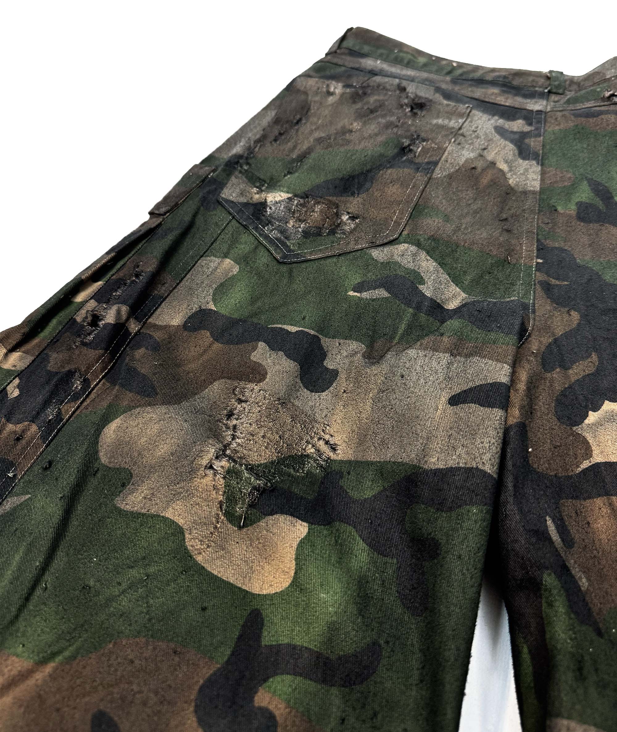 The final finishing steps such as distressing the pants & applying the motor-oil color are all done by hand in our Studio in Berlin-Kreuzberg. This makes every single pants unique. The coloring will also differ a bit from pants to pants. The Motor Oil - Camo pants have the same cut and fabric as its predecessor, the Combat Camo Pants.